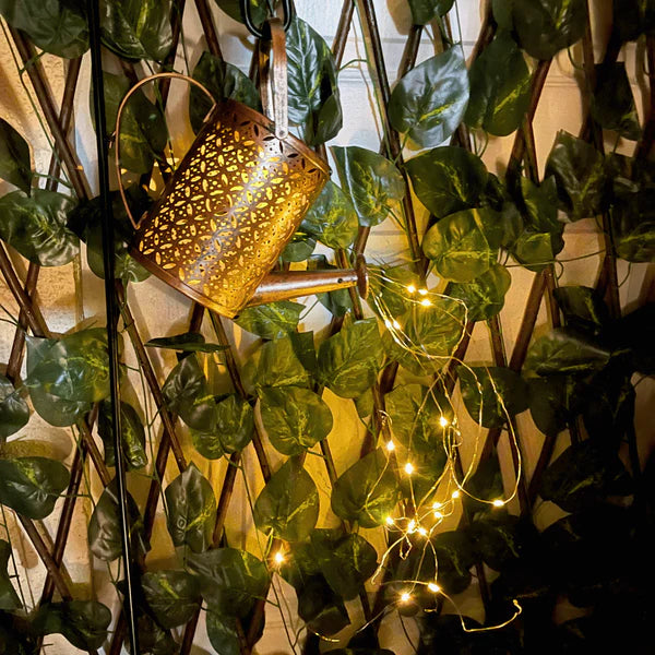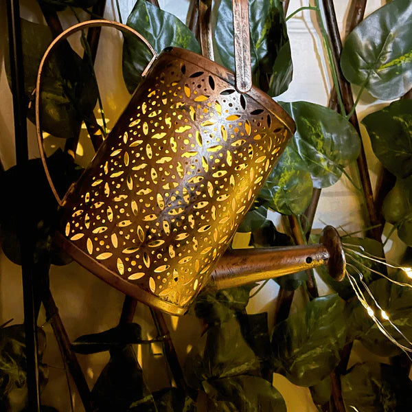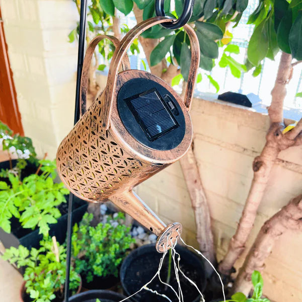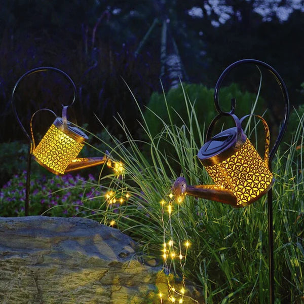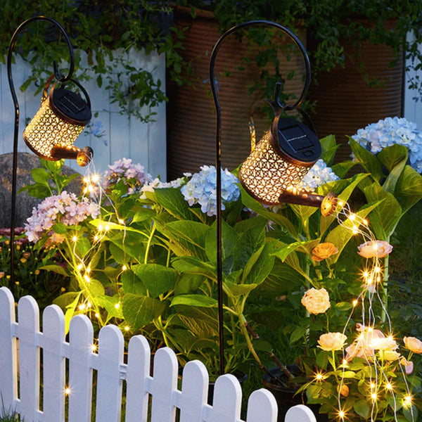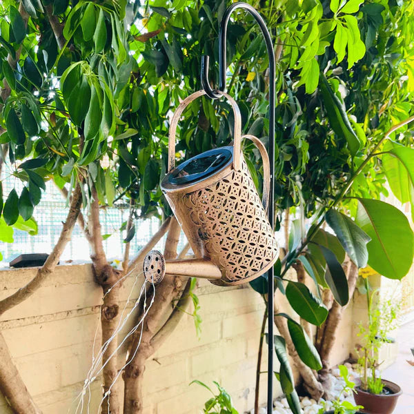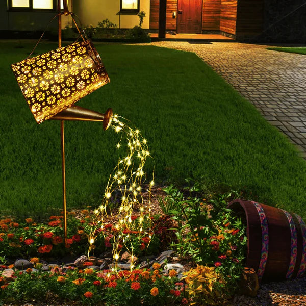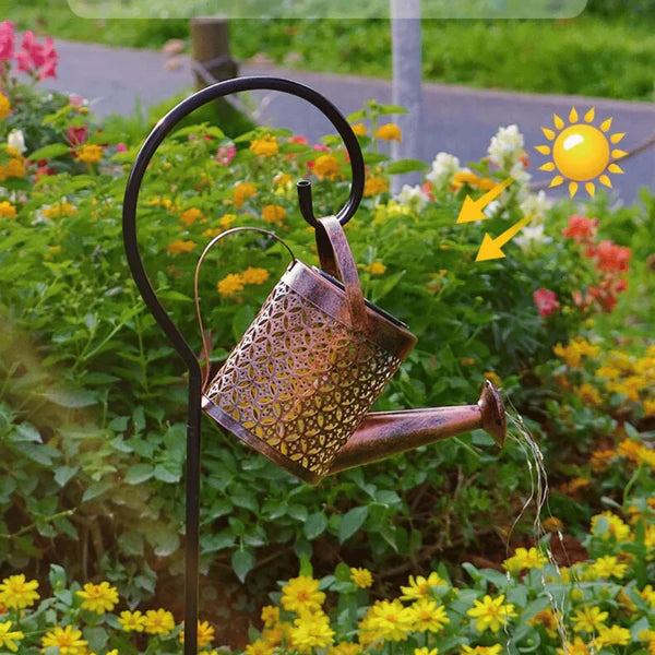 Esta hermosa regadera solar crea un efecto mágico de agua cayendo con luces LED en forma de gotas brillantes. Se carga durante el día con energía solar y al caer la noche transforma tu jardín, patio o terraza en un espacio encantador y relajante. Diseño único con mandala que añade elegancia y serenidad a tu hogar.